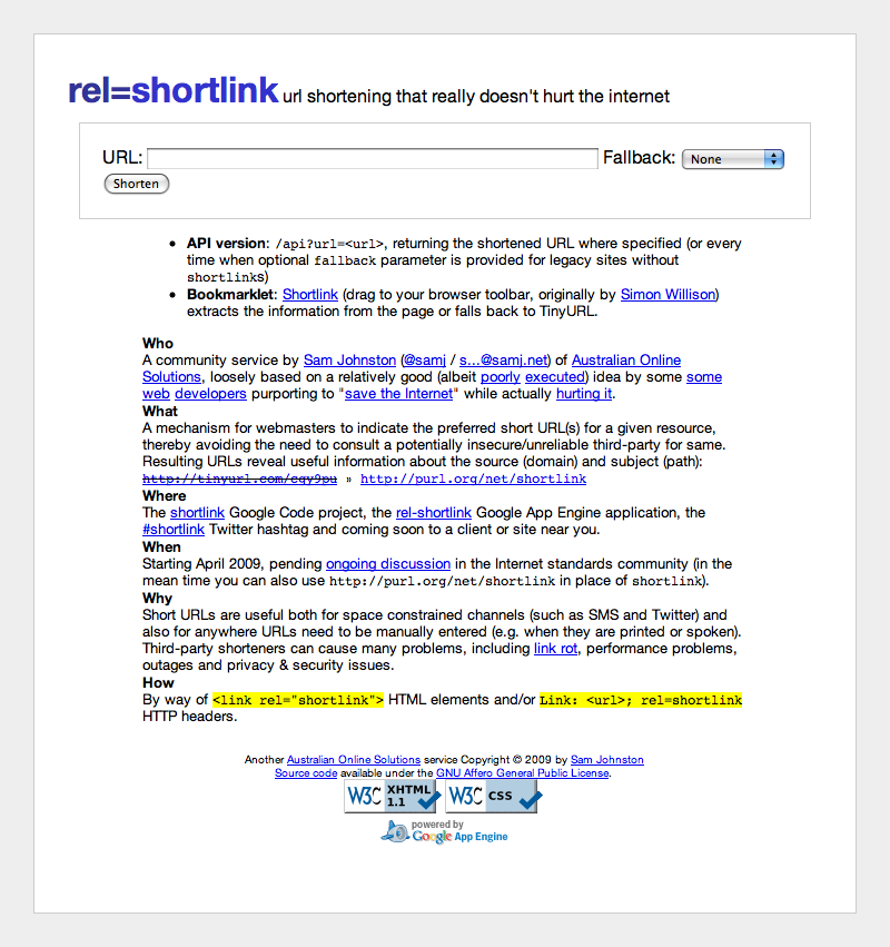 It works just like TinyURL and its ilk, accepting a URL and [having a crack at] shortening it. It checks both the response headers and (shortly) the HTML itself for rel=shortlink and if they’re not present then you have the option of falling back to a traditional service (the top half a dozen are preconfigured or you can specify your own via the API’s “fallback” parameter).